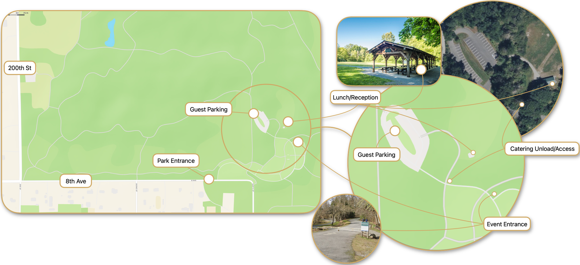 - Guests: Enter the private picnic area and park in the prviate parking area, then use the short path to the ceremony, immediately east of the parking lot
